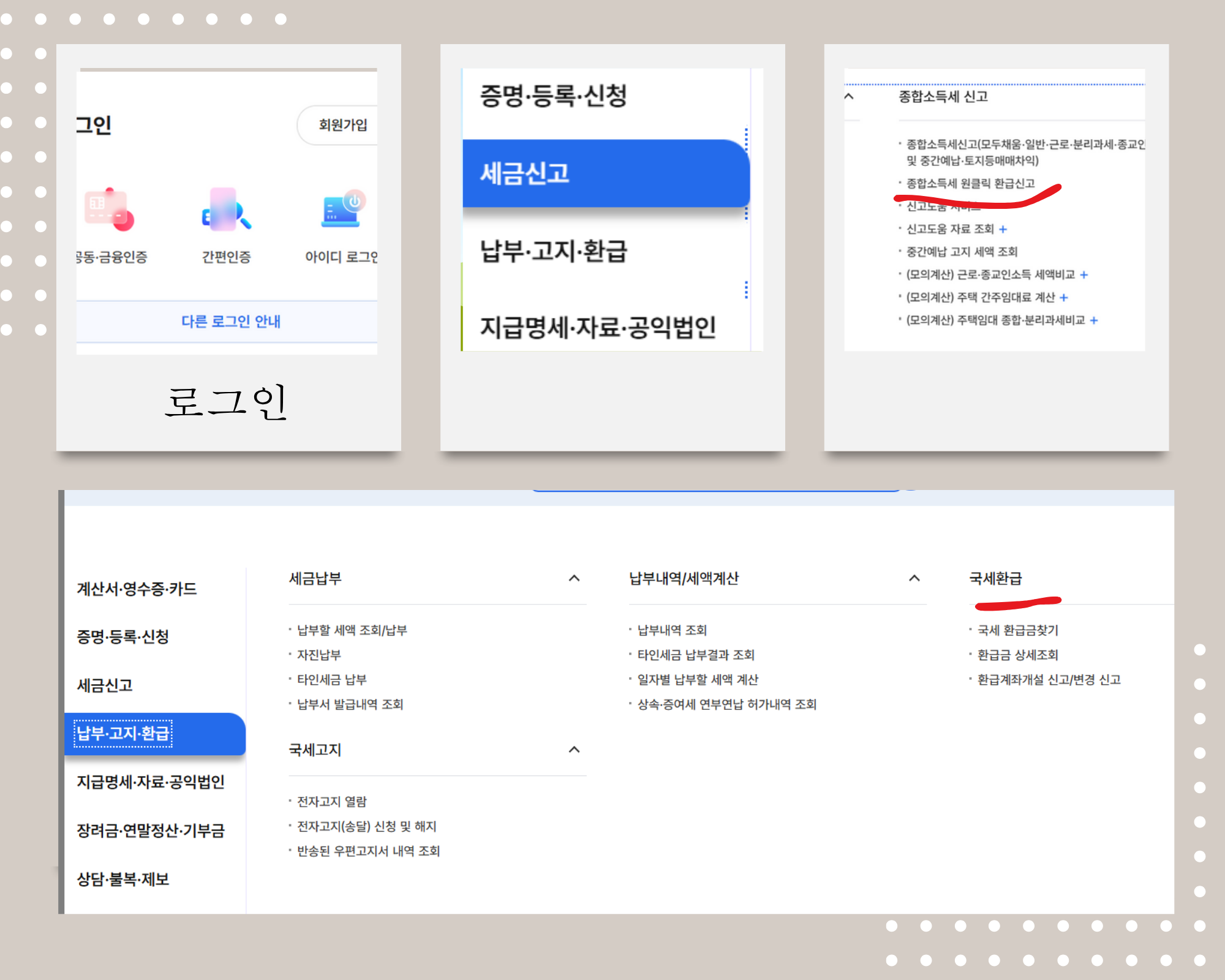 홈택스 접속 후 다음 경로로 이동하면 됩니다:세금신고 → 종합소득세 신고 → 종합소득세 원클릭 환급신고